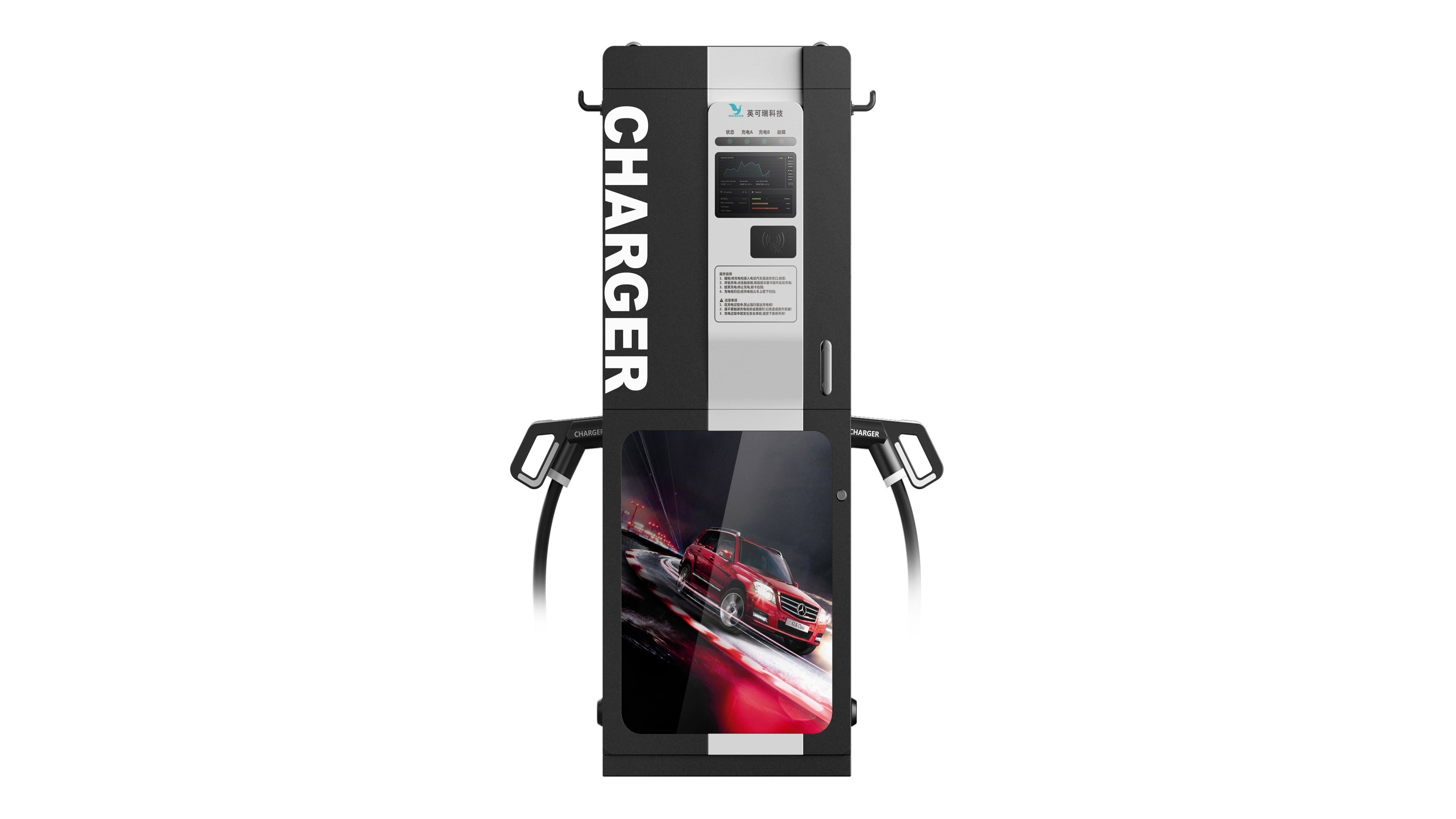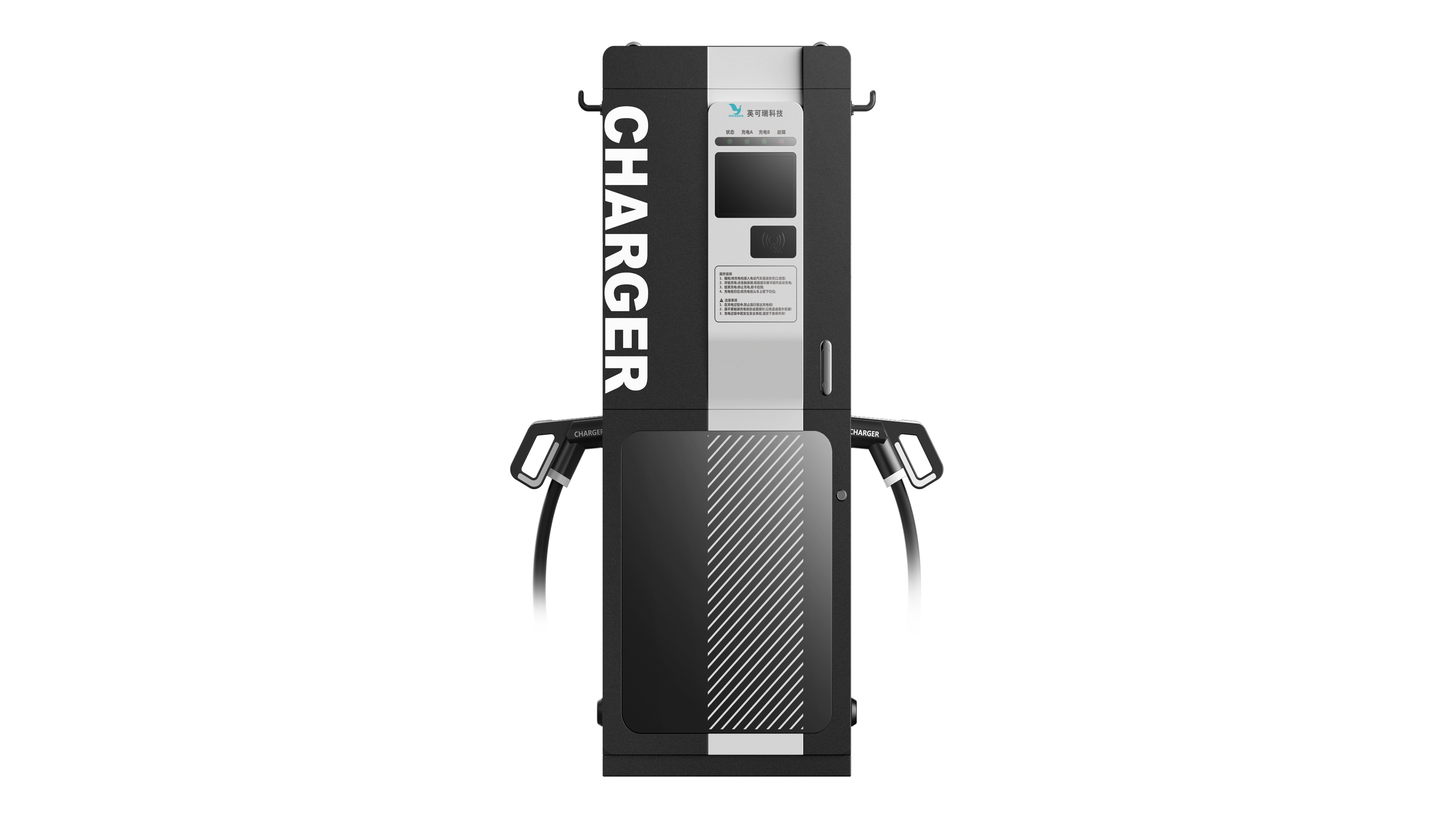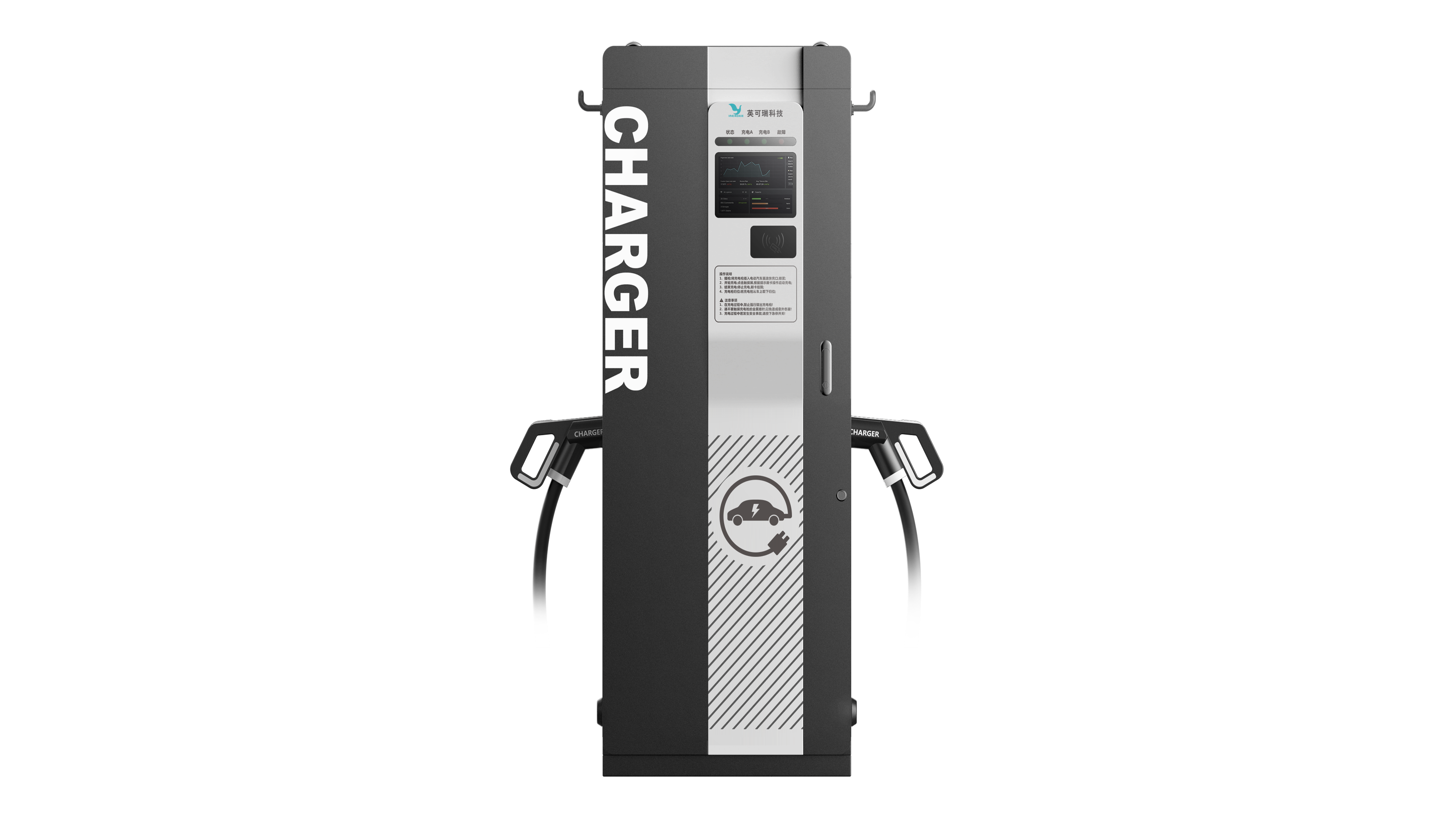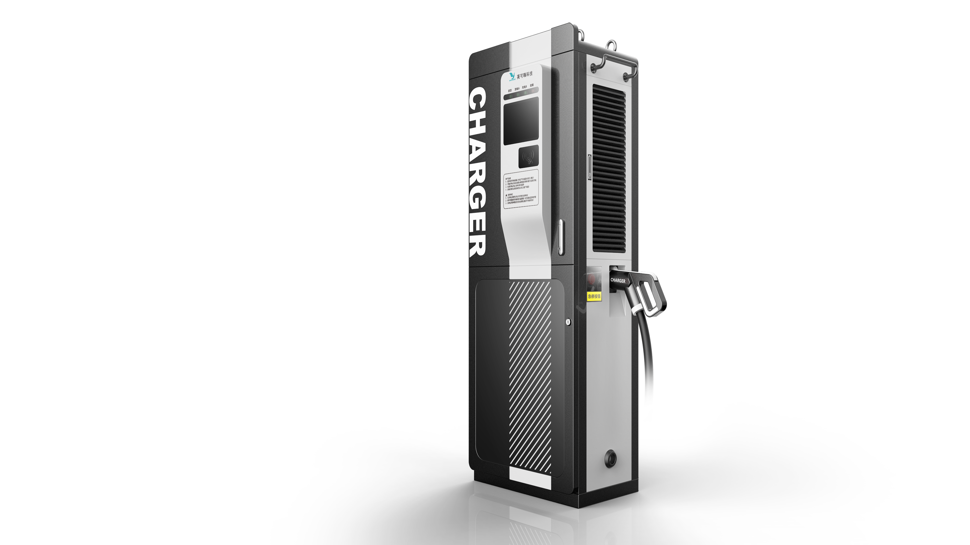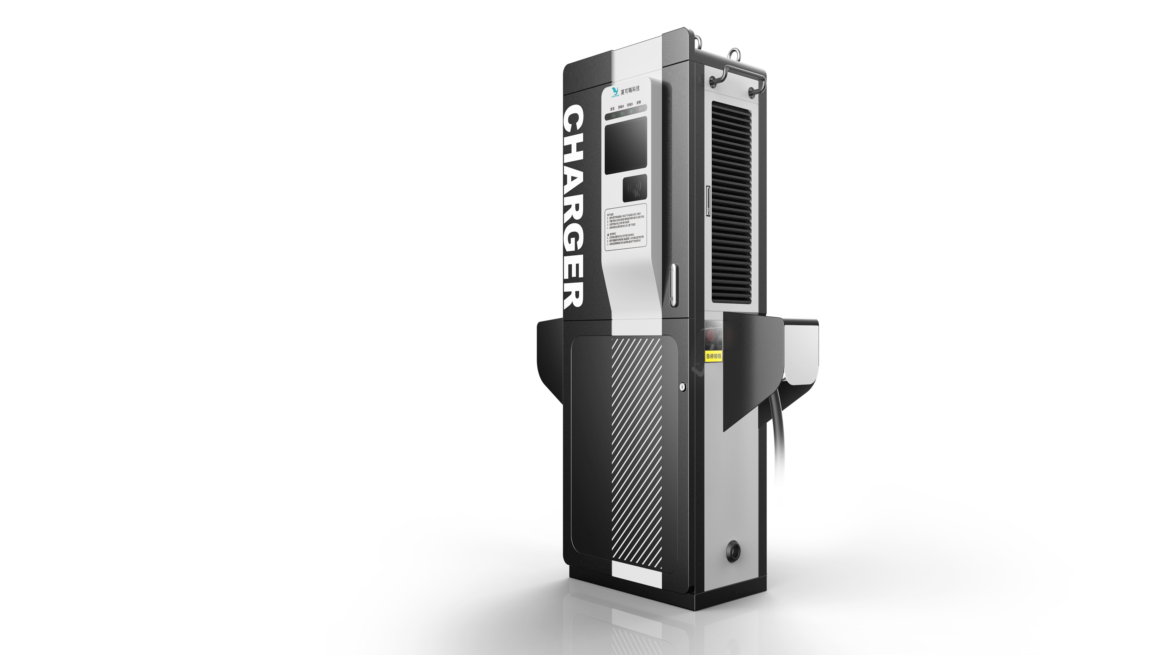 這款充電樁外觀獨特、新穎、采用計算機灰、黑色色帶的配色,符合現代審美觀。結構設計上充分利用內部空間、承載結構安全可靠,防火設計覆蓋國際標準,顏色、大小和材料選擇符合市場預期和用途,是科技與設計的結合。