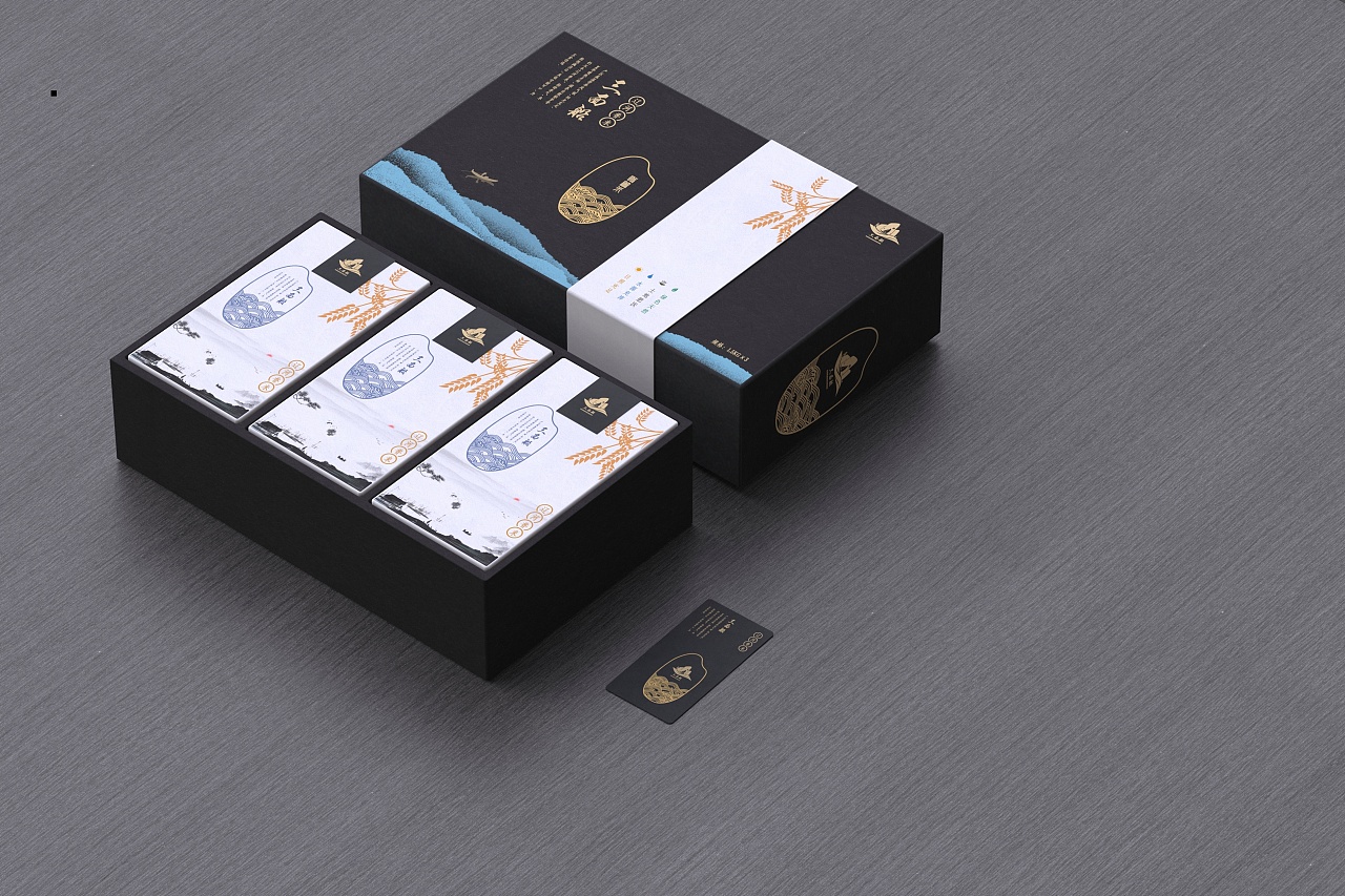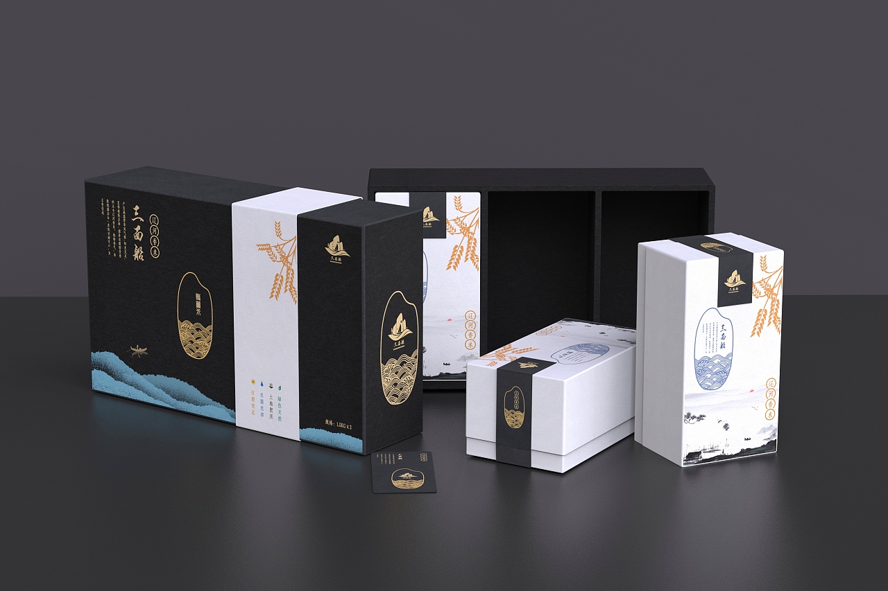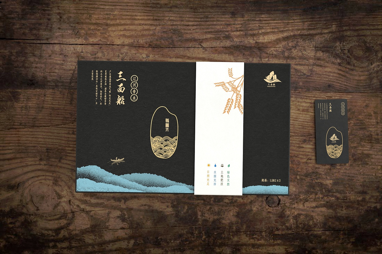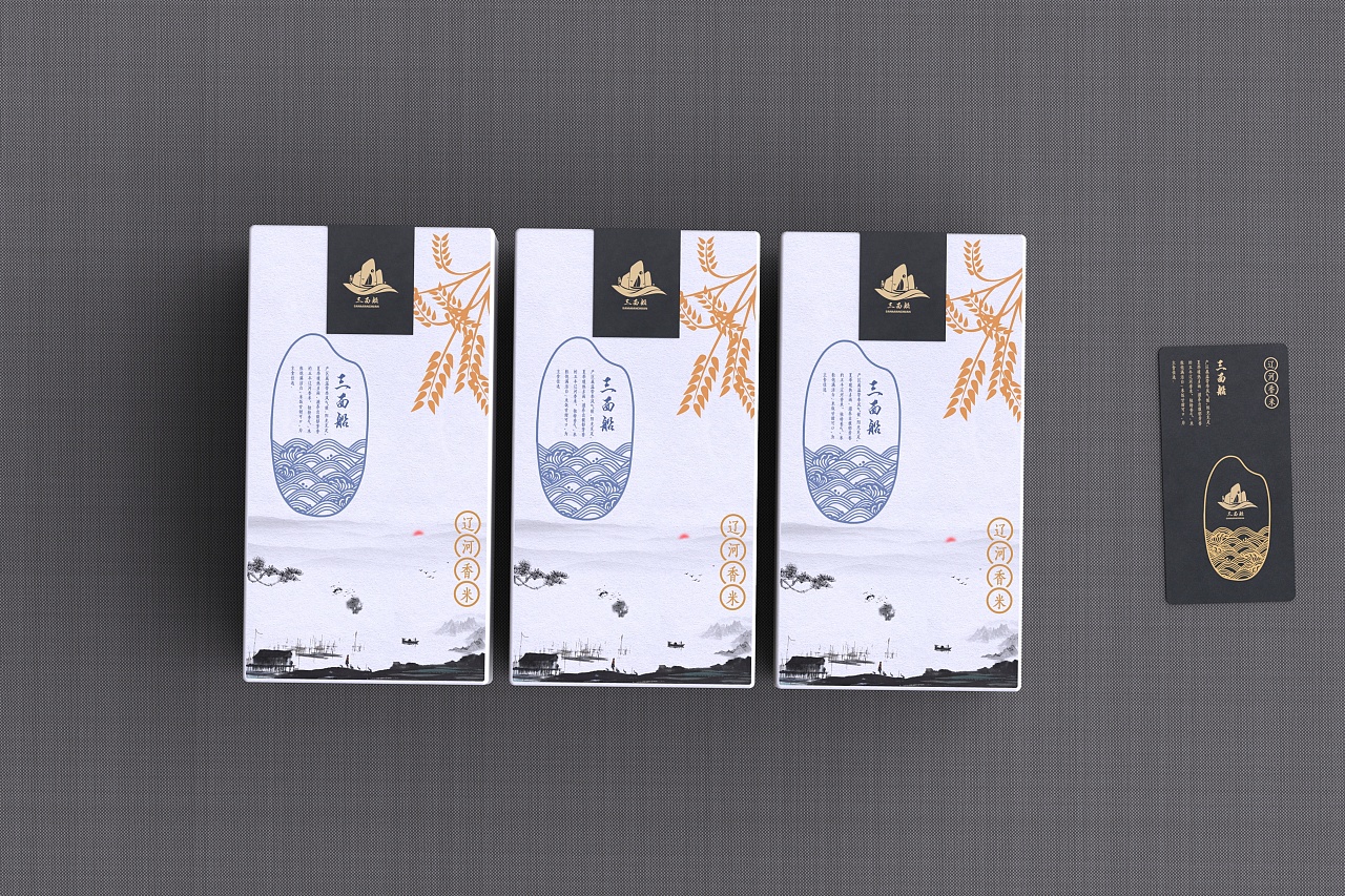 三面船,遼河香米。以水、米和船為設計的核心要素,賦予大米以文化氣息。